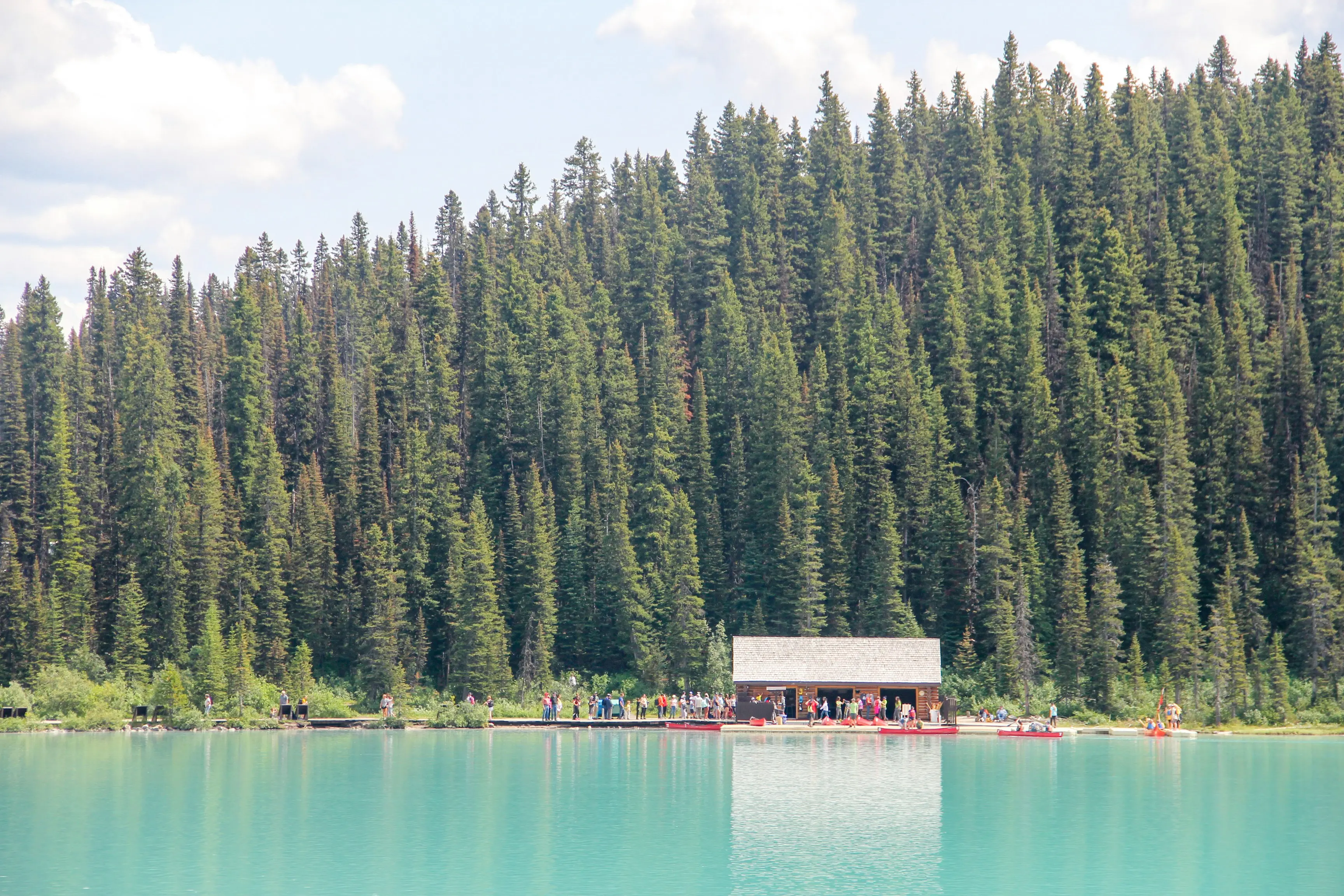 Called the "Lake of the Little Fishes" by natives, the emerald waters of Lake Louise in Alberta's Banff National park have been attracting tourists since the late 1800s. The lake gets its spectacular green color from glacial runoff that contains certain kinds of sediment. As the glaciers melt, they carry rock flour into the lake, and the minerals in the rocks produce the hues the lake is known for. The lake shares its name with a nearby hamlet.
